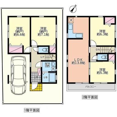 | 間取り(内訳) | 4LDK(洋7.1/6.6/6.3/5.3LDK13.8) | 建物面積 | 99.36㎡ |